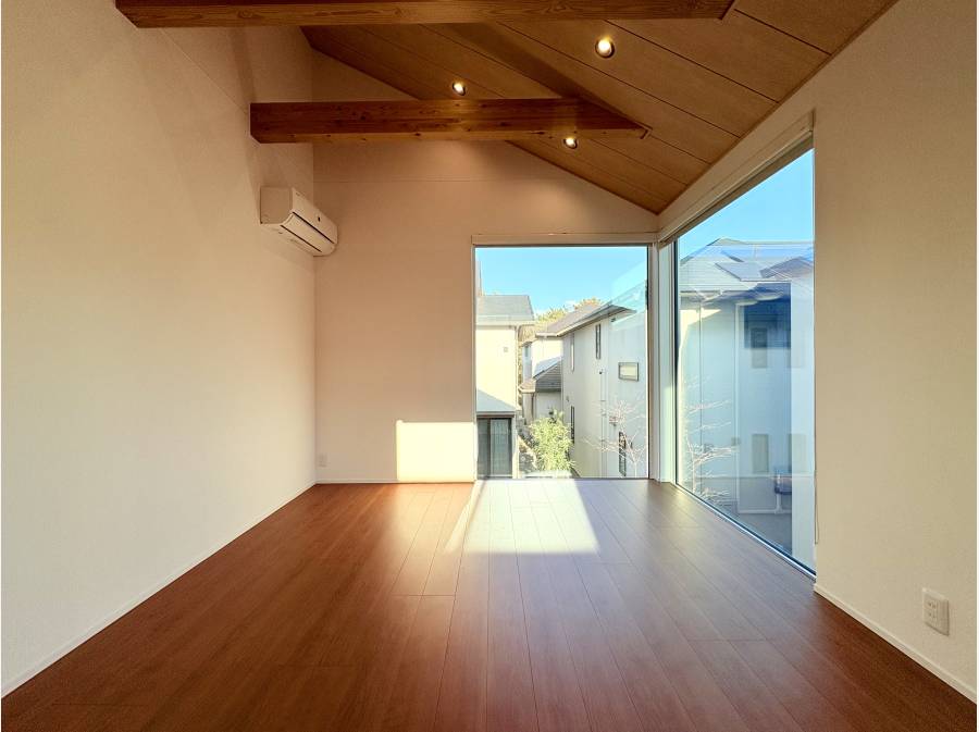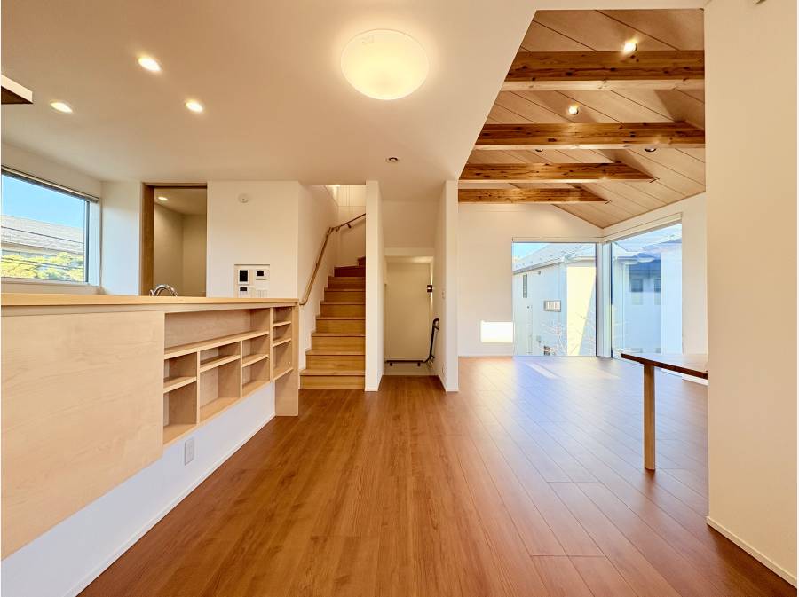 吹き抜けのある空間が、室内に開放感をもたらします。大きなガラスから庭の様子を見渡せるため、お子さまを見守りながら安心して過ごせ、自然光が部屋全体を明るく照らします。