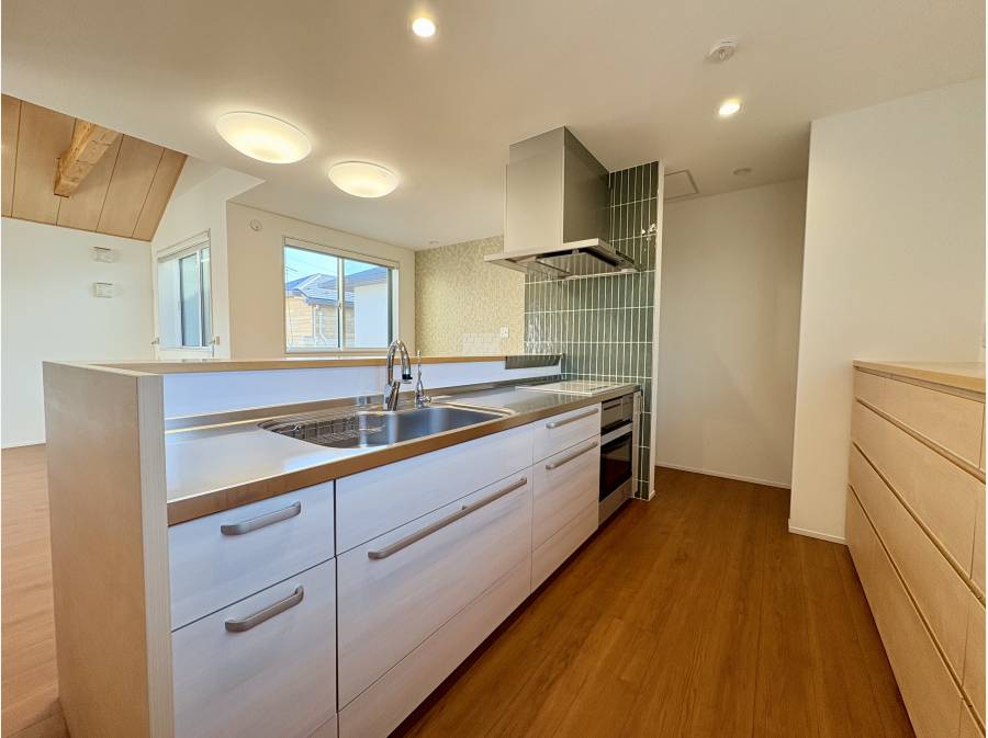 対面式のキッチンは収納スペースが広く調理の幅を広げてくれます。キッチンの背面にある窓からは小学校の様子が見ることができお子様の様子を伺うこともできます。