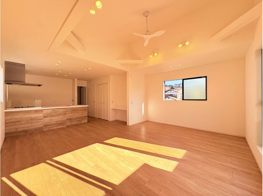 勾配天井が開放感を演出する約20.3帖のLDKには、リビング・ダイニング部分に床暖房を完備。