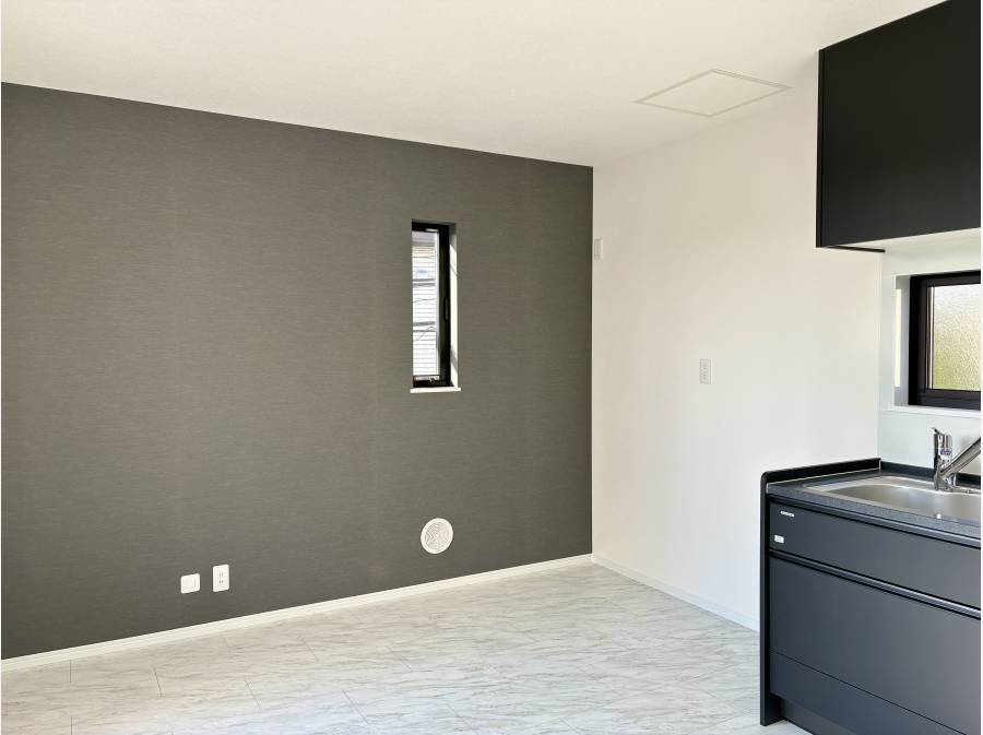 ブラックを基調としたキッチンと、明るい床材のコントラストが、空間に心地よい緊張感と上質さをもたらします。