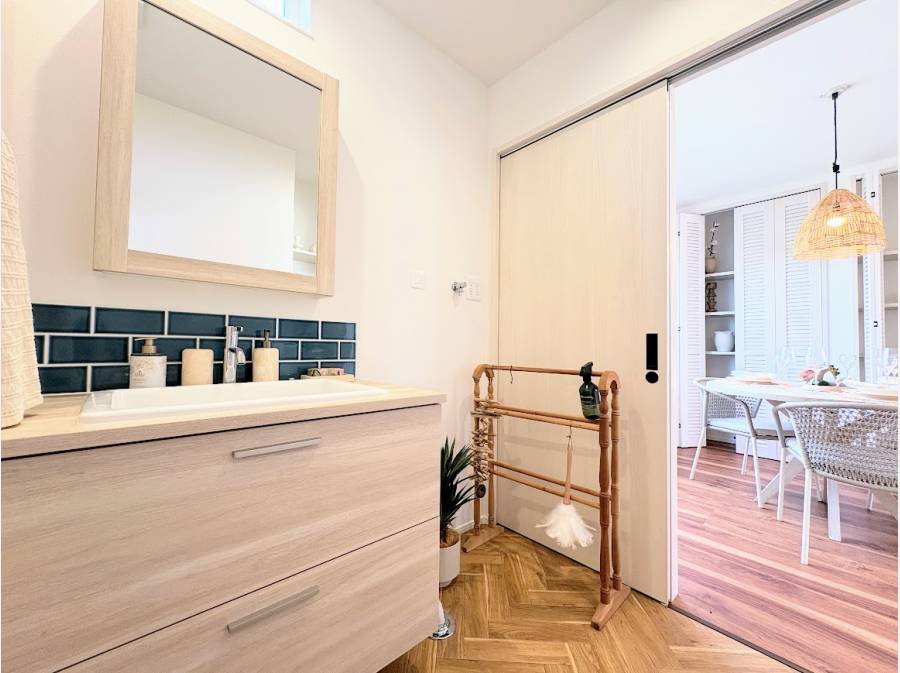 この物件の魅力は、女性設計士が細部までこだわり抜いたデザインです。ルーバー建具やウッドデッキ、便利な温水シャワーなど、湘南での暮らしをより豊かにする設備を採用。毎日がリゾート気分になる空間です。
