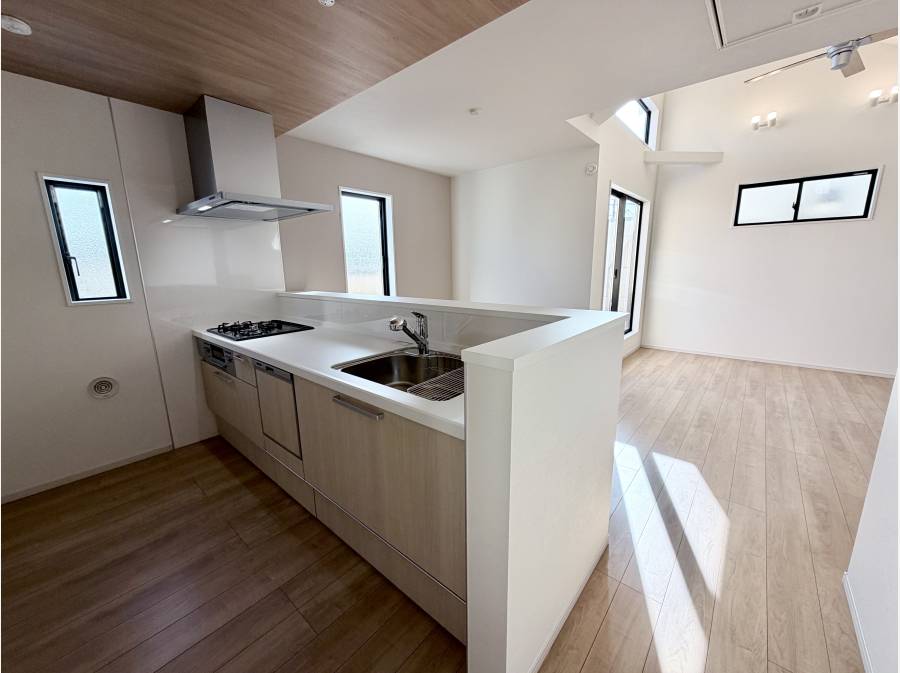 キッチンは対面式でリビングにいる家族の様子を見ながら調理することができます。