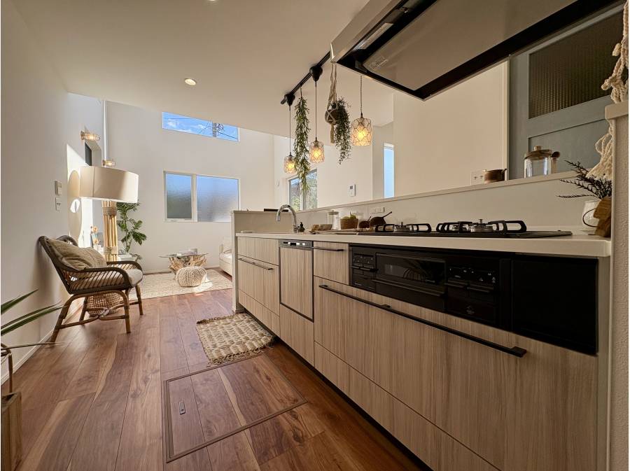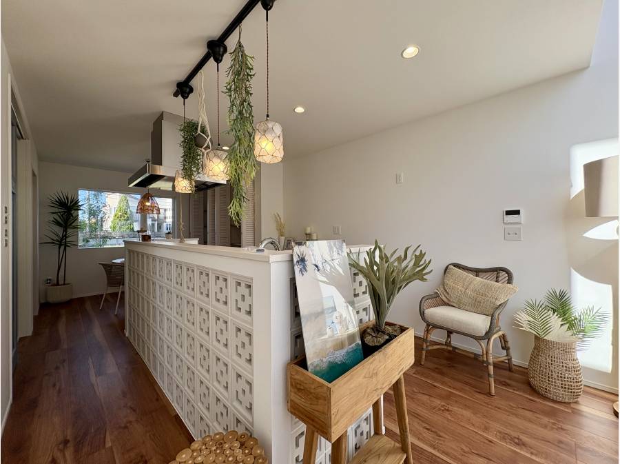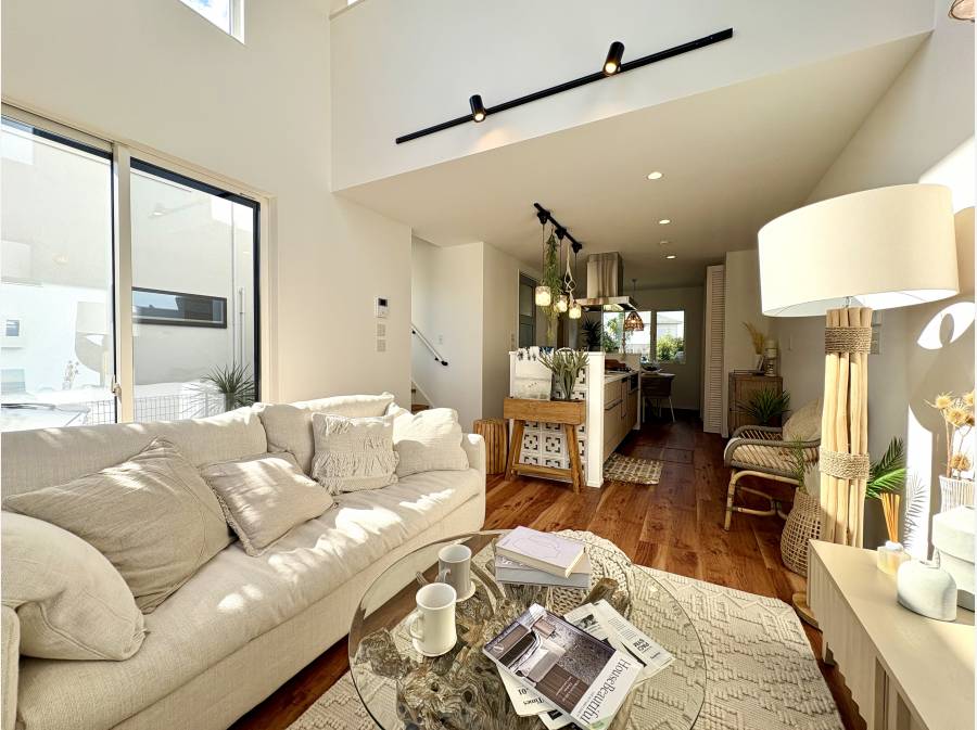本鵠沼駅徒歩11分 。カリフォルニアの風が吹く、暮らしの中心は、アイランドキッチン。家事効率とデザインが交差する、光の吹き抜けリビング。