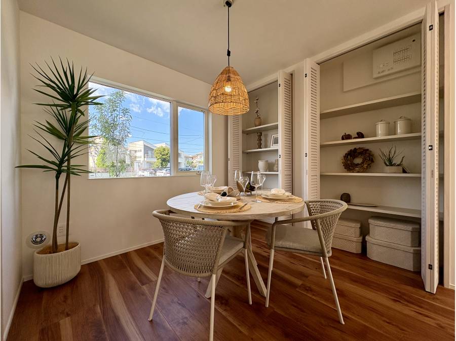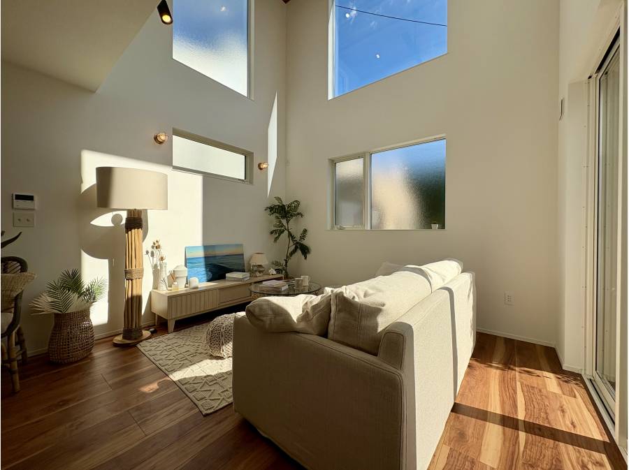 LDKは、高窓から光が降り注ぐ吹き抜け と、木の温もりを感じるシーリングファンが、開放的で心地よい空間を演出します。