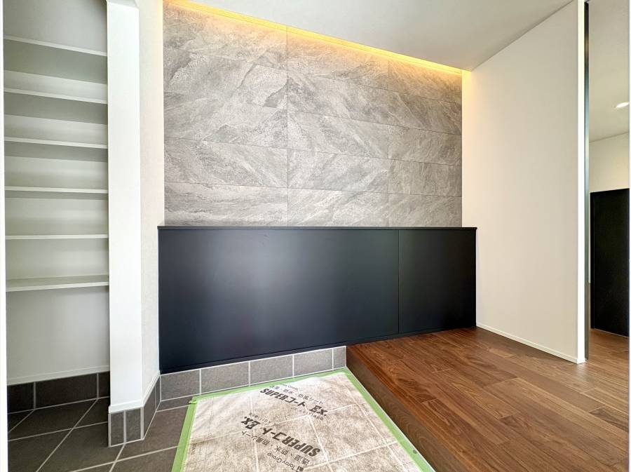 玄関ホールに入ると、腰壁に設えられたマグネット対応のアクセントボードが迎えてくれます。
