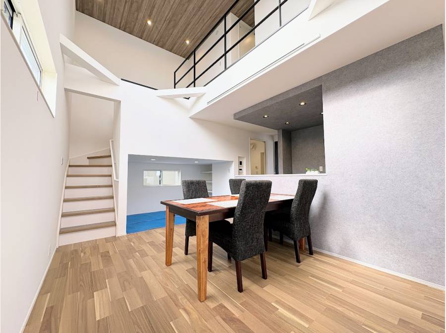 LDKと和室がつながるワンフロアは、なんと約22帖超えの広大さ。さらに吹き抜けを採用することで、実際の広さ以上のダイナミックな開放感を演出しています。家族みんながのびのびと過ごせる、笑顔あふれる憩いの空間です。
