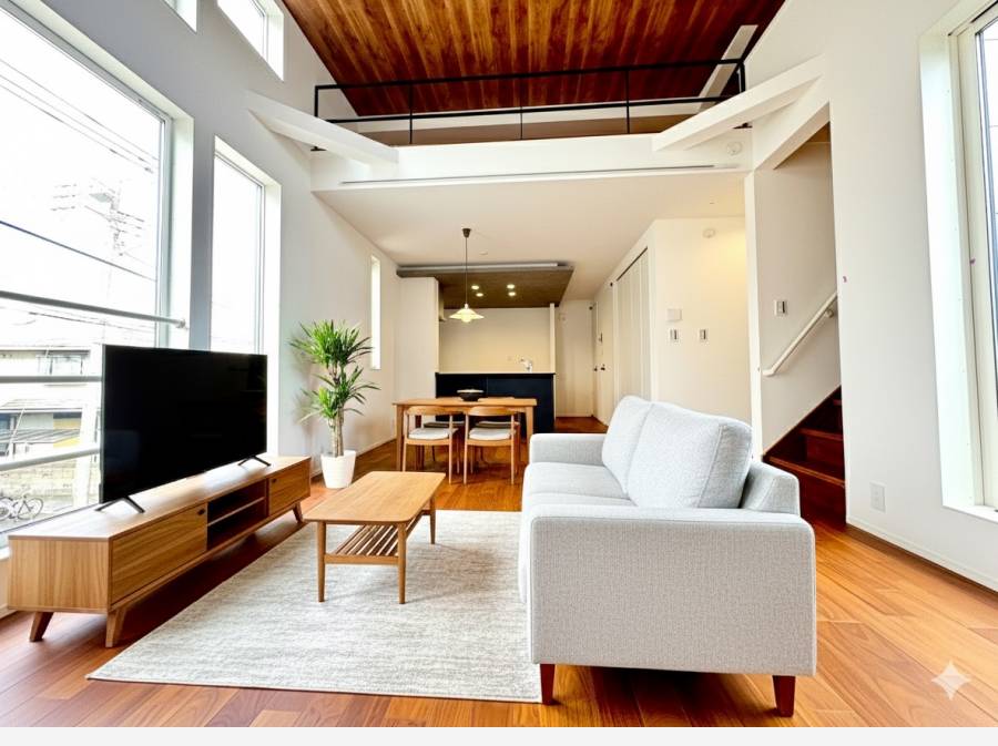 2階のLDK約18.8帖は吹き抜けになっており、開放感とプライベート空間が守られ、ゆったりとお過ごしいただけます。