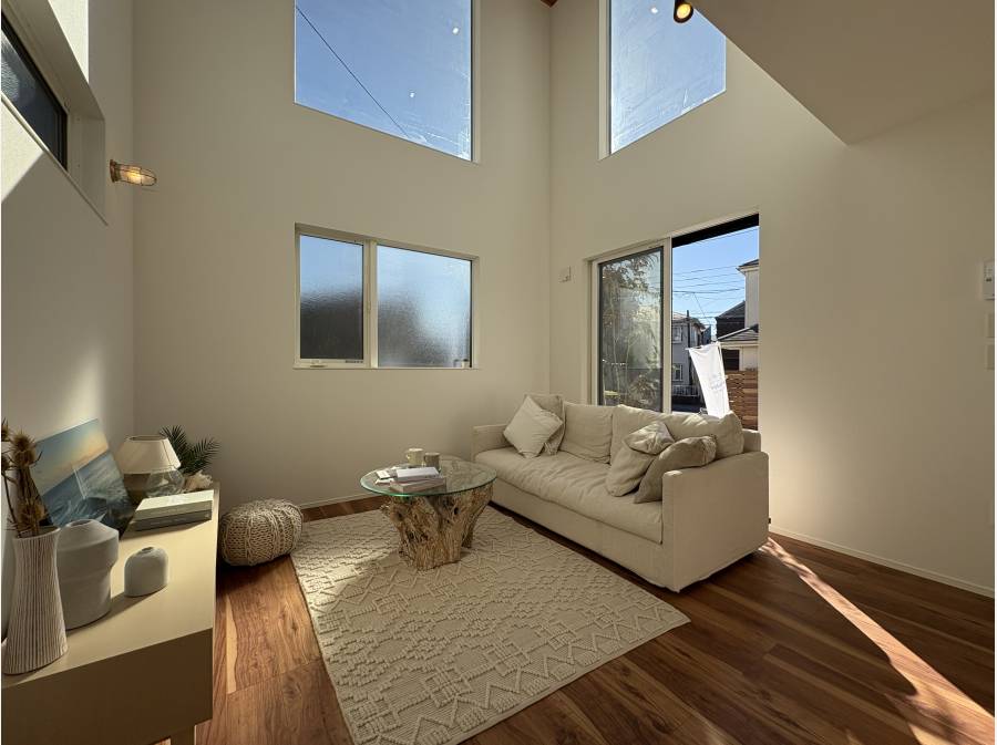 リビング上部は吹き抜け空間により、太陽の光りがサンサンと差し込みます。