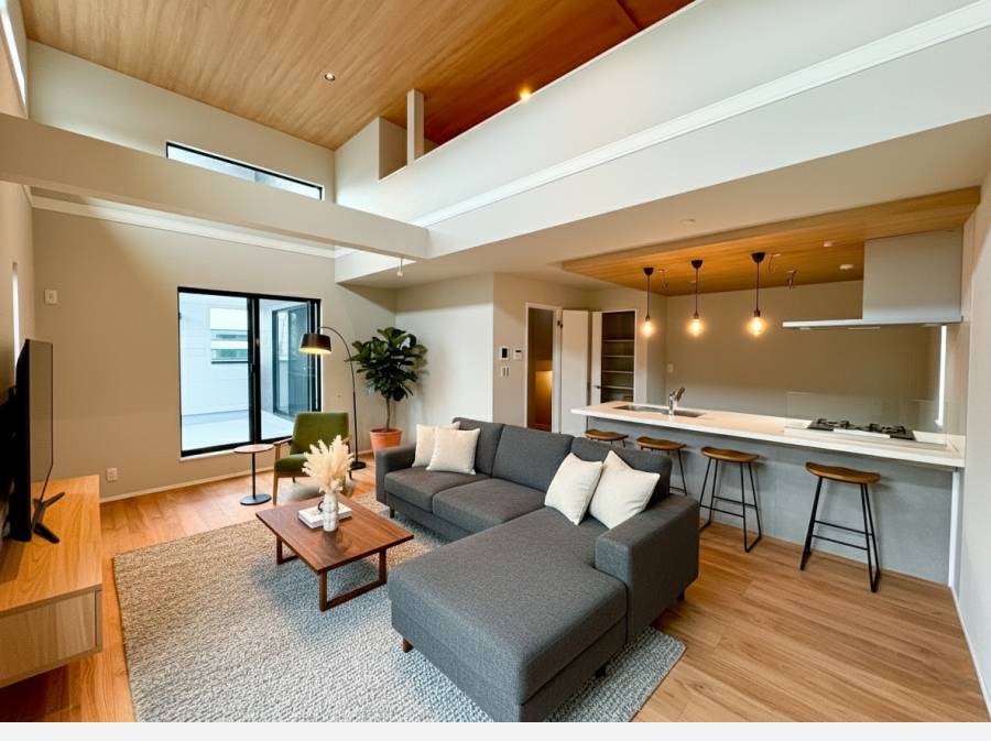 陽光が差し込むリビングは、家族が自然と集まる心地よい場所となるでしょう。