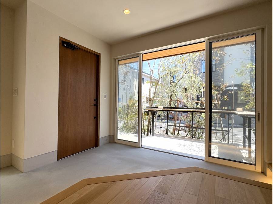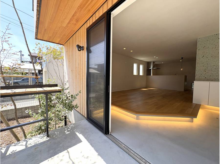 リビング前に広がるオープンスペースには、優しい木漏れ日。