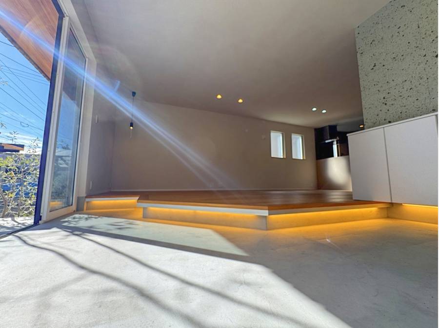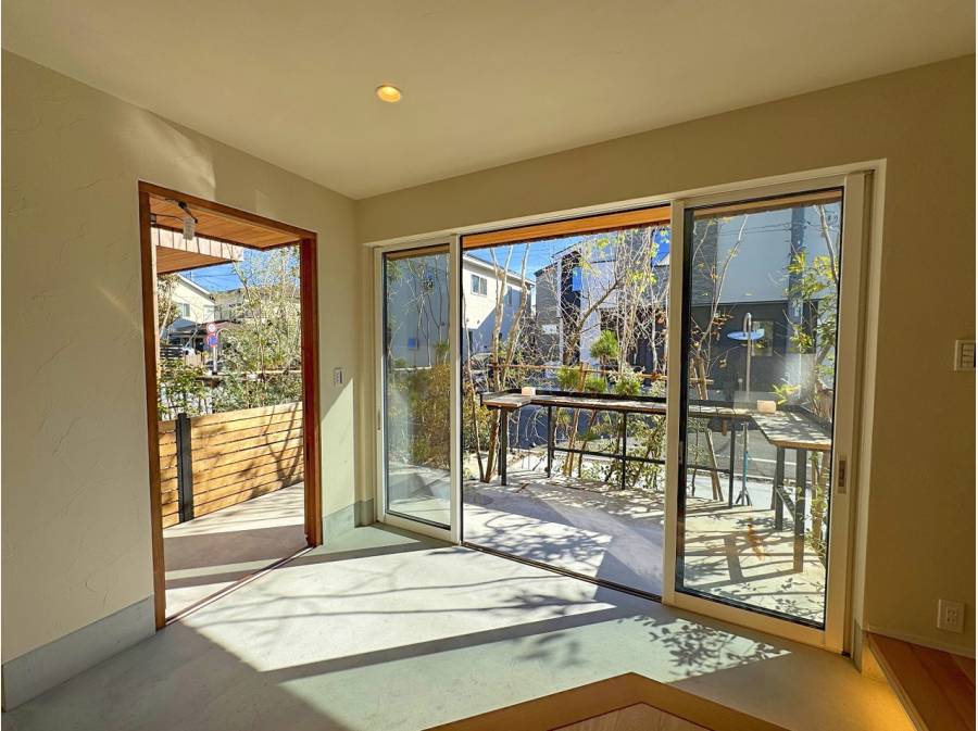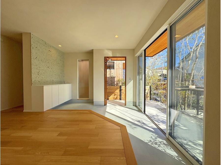 玄関から土間、リビング、テラスへと続く美しい動線。