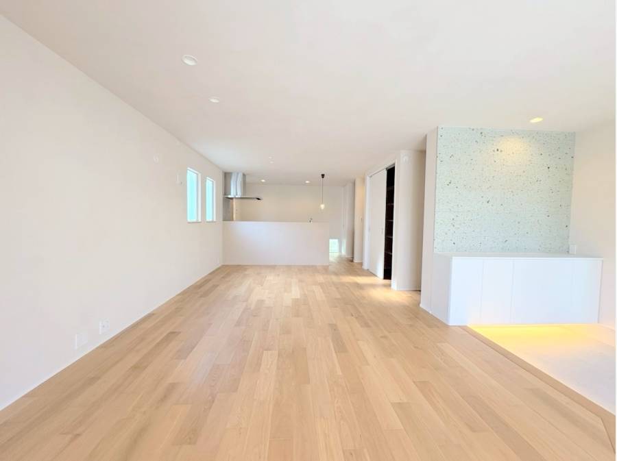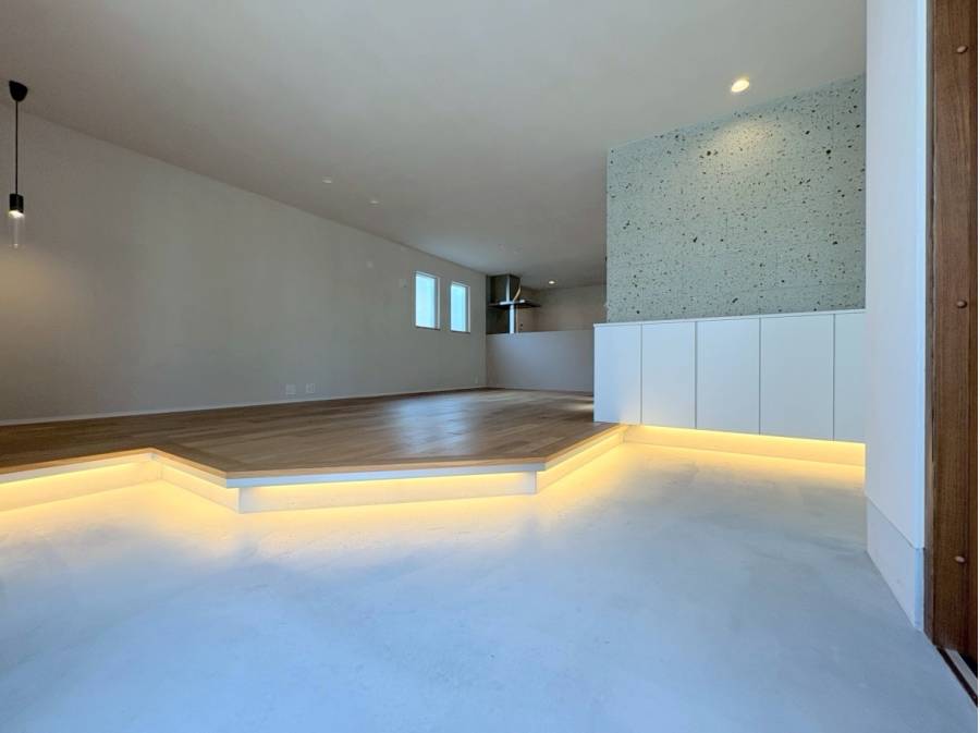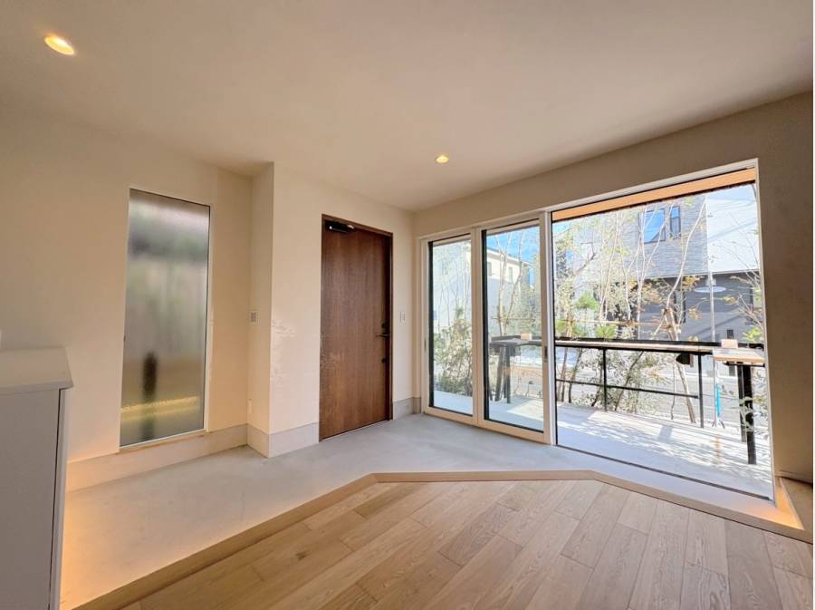 エントランスを抜けると、約21帖の広々としたLDKが広がり、土間スペースとテラスがゆるやかにつながる心地よい空間に。