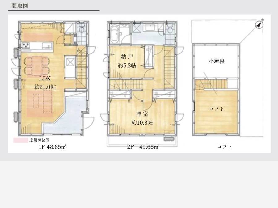 | 建築確認番号 | 間取り | 1LDK + 納戸(5.3帖)+ロフト+小屋裏収納 | |