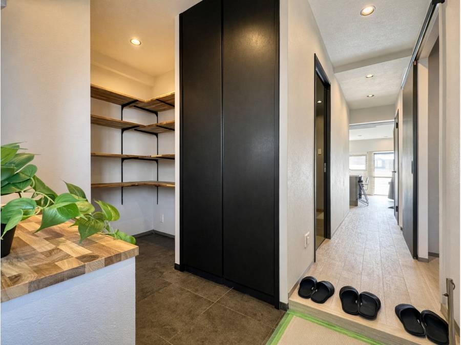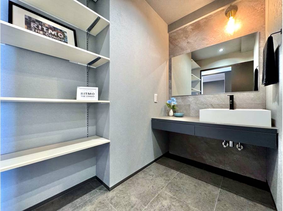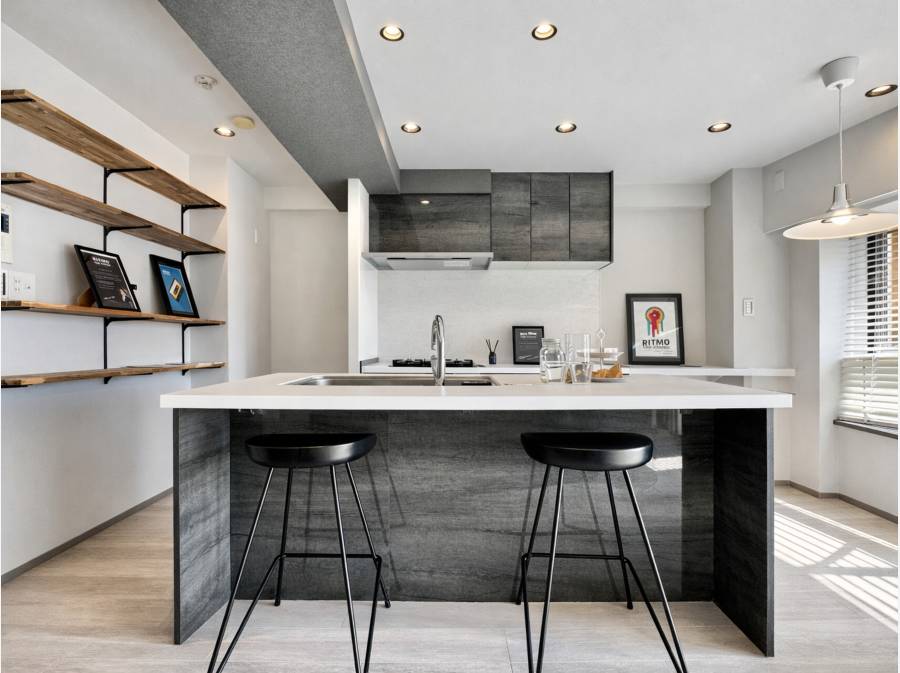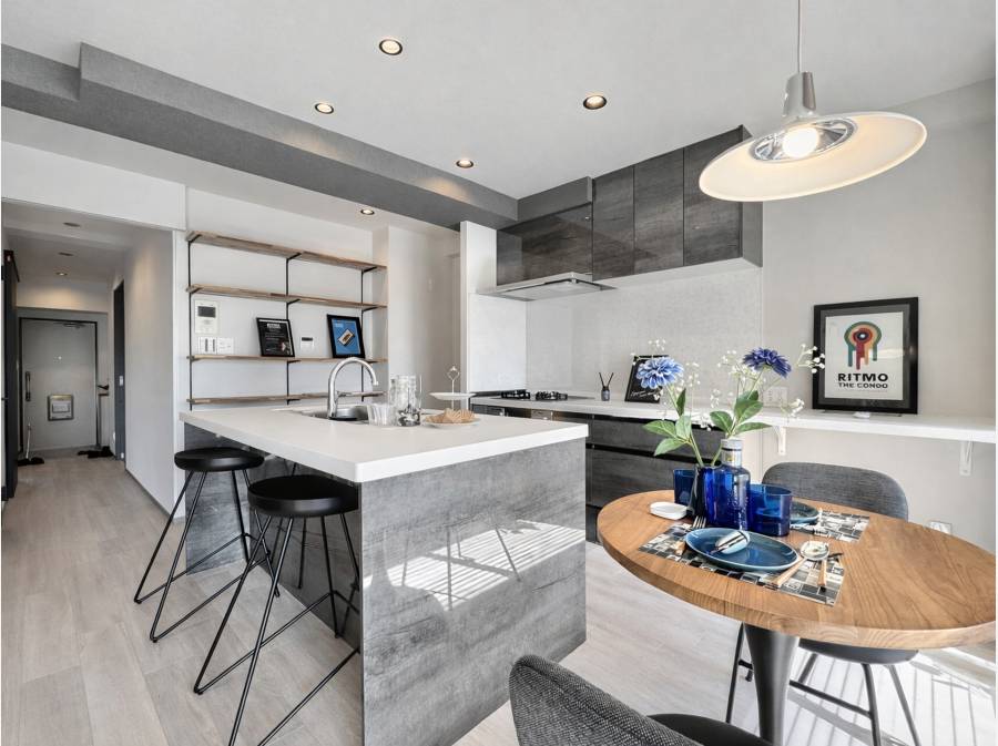 藤沢駅徒歩5分。街の利便と住まいの上質を両立するリノベーション住戸です。室内は53.46㎡のゆとりある1LDK。主役は、空間を引き締めるブラックキッチンと、カウンターを囲む“BARのような”ダイニング。照明の陰影が心地よく、夜が似合う大人の住空間に仕上がっております。