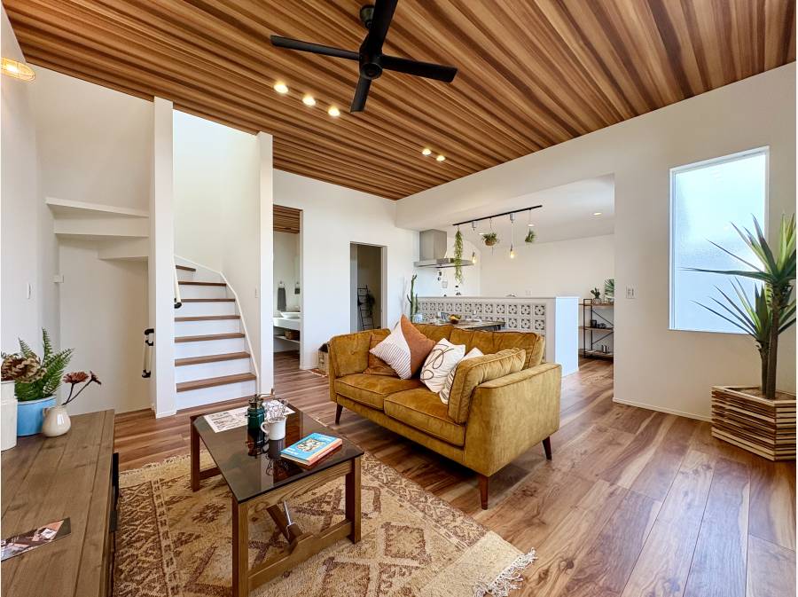 天井高約2.9mのリビングにはシーリングファンが設置され、まるでホテルのラウンジのような優雅で快適な空間を提供します。