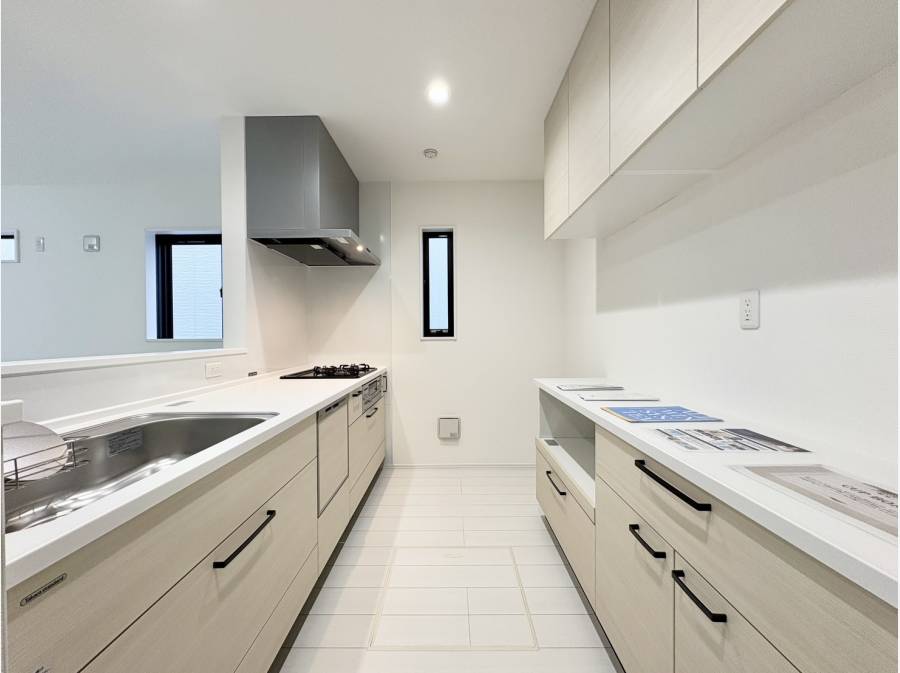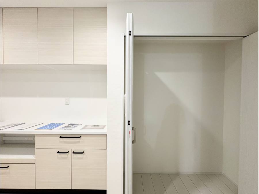 キッチンスペースにはカップボードとパントリーもございますので、キッチン用品やストック食材もスッキリまとめられます♪