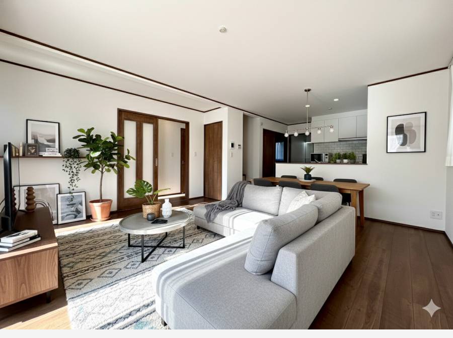 開放的な1階LDK、家具や小物等はCGで作成したイメージです。