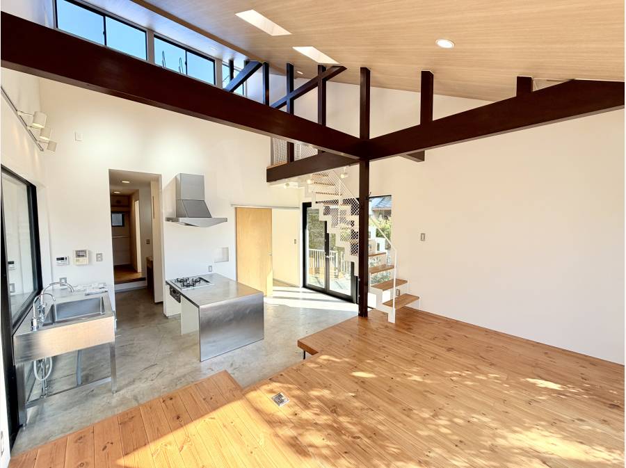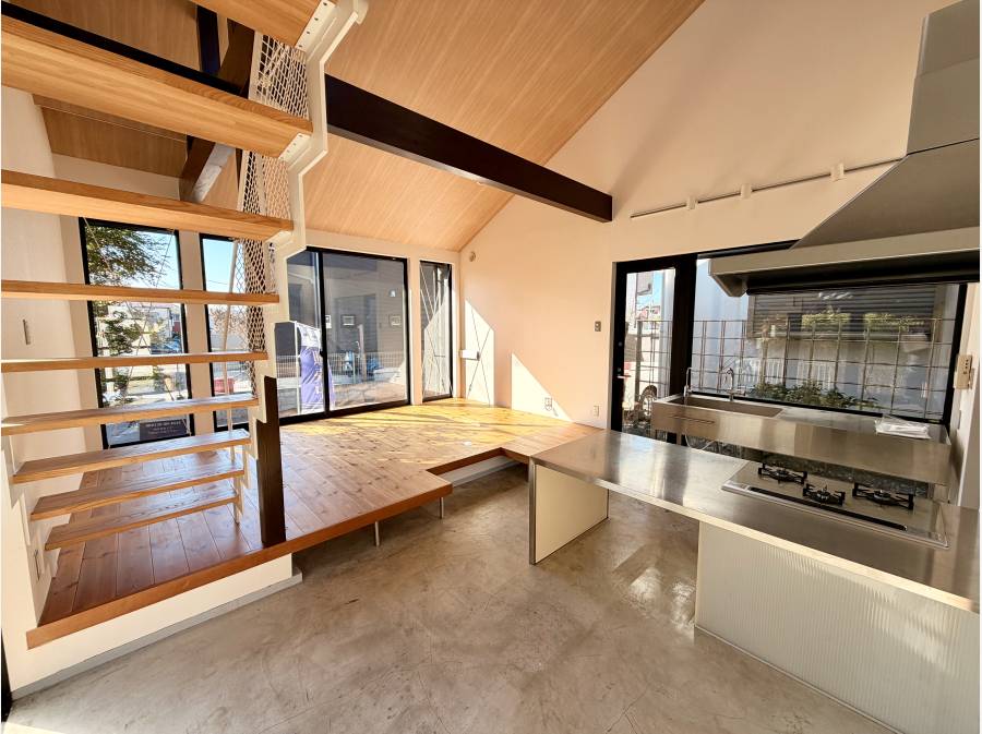 LDKは15帖。土間が広く買い物から帰ってきたらそのままキッチンに立って調理することのできる間取り。また吹き抜けのある開放的空間が印象的です。