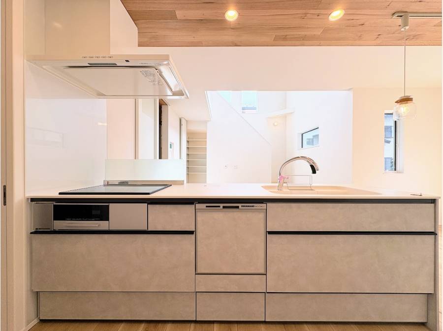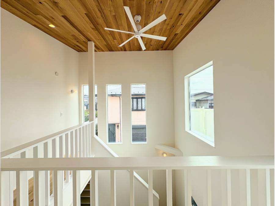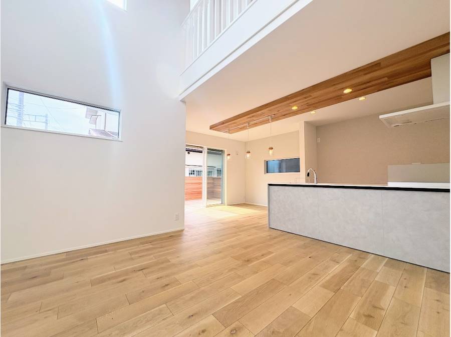 【光と風を感じる開放的なLDK】 リビングには大きな吹き抜けを採用しました。たっぷりの陽光と圧倒的な開放感が、家族の団らんを明るく包み込みます。