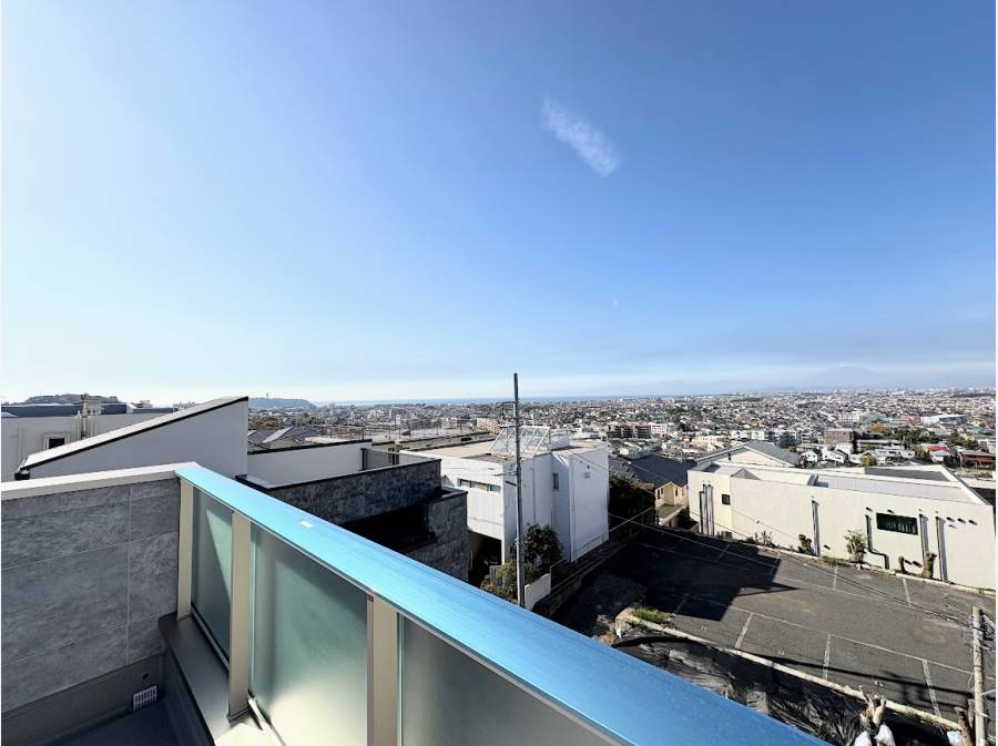 この物件の最大の魅力は、何といってもその眺望です。 ルーフバルコニーに出ると、海、雄大な富士山、そして江ノ島を一望するパノラマビューが目の前に広がります。息をのむような美しい景色を独り占めできる、まさに特等席です。