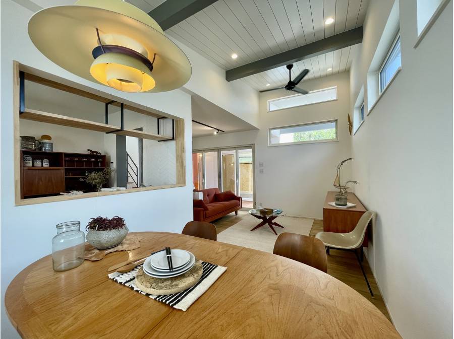 木と石、自然素材が奏でる調和が、ミッドセンチュリーの落ち着きと現代的な洗練を併せ持つ