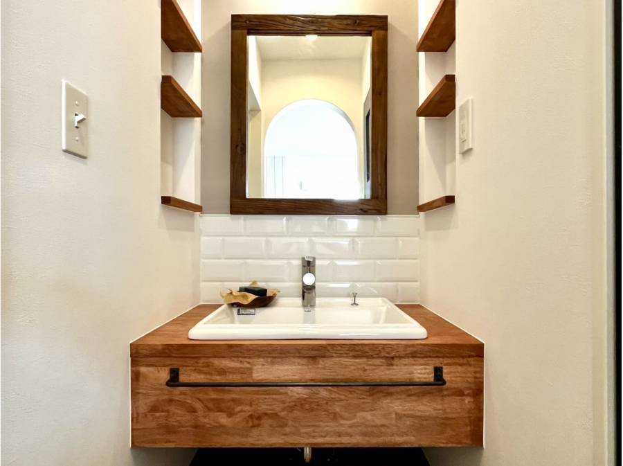 収納としても機能するオリジナルのダイニングベンチや、素材感あふれる造作洗面台など、女性設計士の視点による細やかな意匠が随所に光ります。