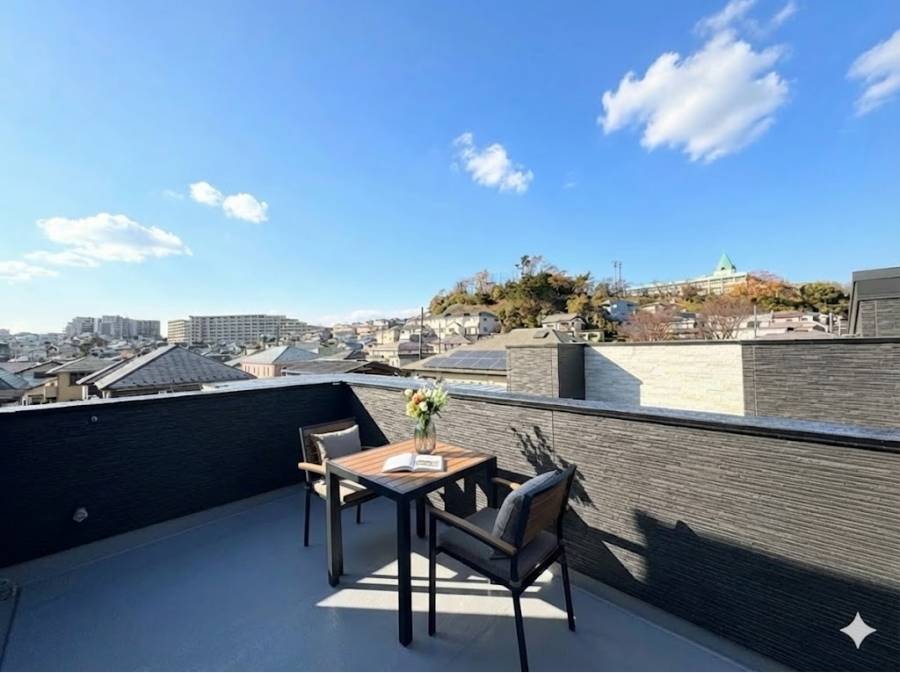 この家の主役は、空とつながる広々としたスカイバルコニー。 晴れた休日はランチを楽しんだり、夜は星空の下でグラスを傾けたり。 自宅にいながらリゾートのような非日常感を味わえます。