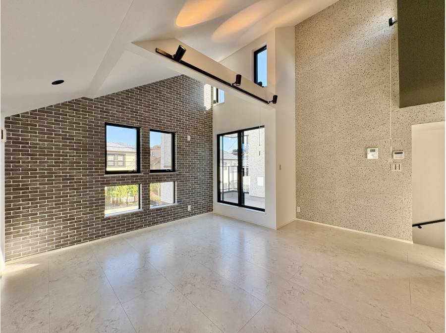 リビングの勾配天井からは柔らかな日差しが降り注ぎ、心地よい時間が過ごせます。