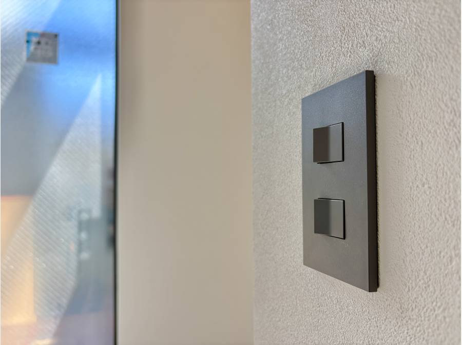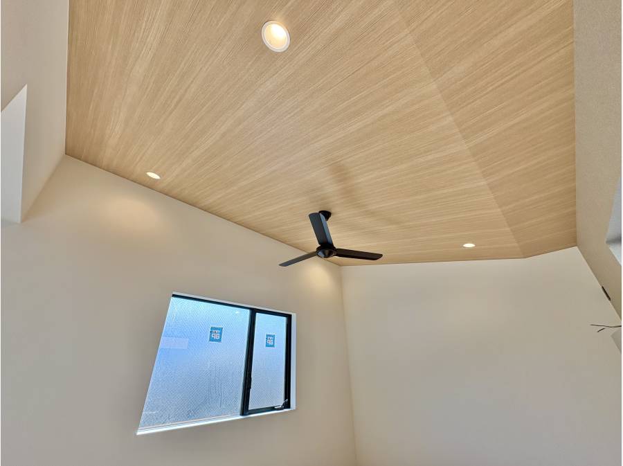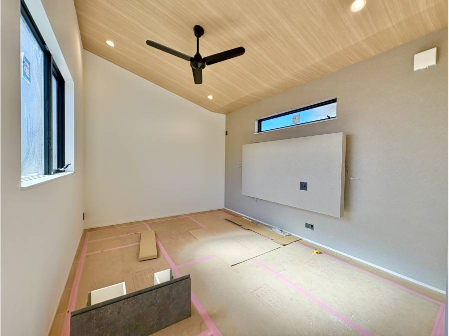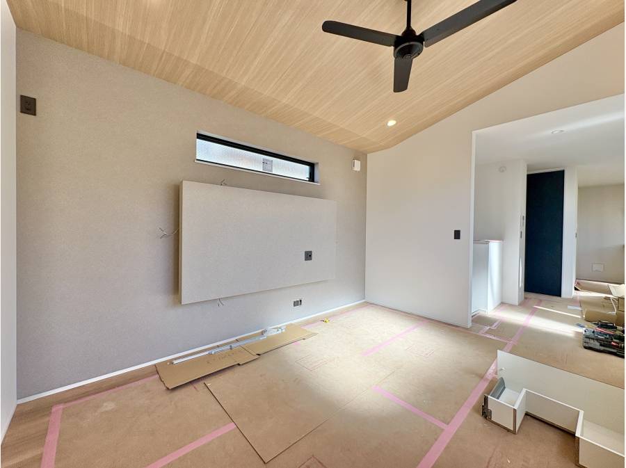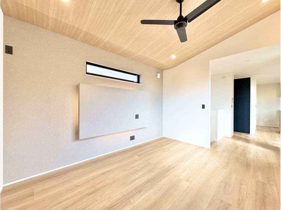 2階のリビングには勾配天井があり、テレビは壁掛けができるようになっております。