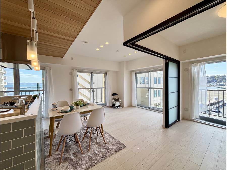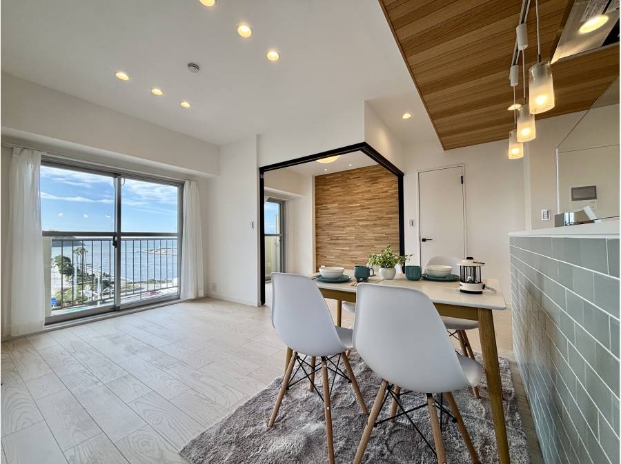 時間帯ごとに変わる海の表情を楽しめるのも魅力。LDKは約14.6帖とゆとりある広さで、隣の洋室と併せると約19.6帖ございます。