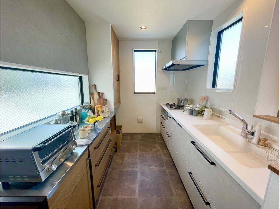 キッチンにはアイランドキッチンを採用し、家事動線に配慮しながらデザイン性も高めました。