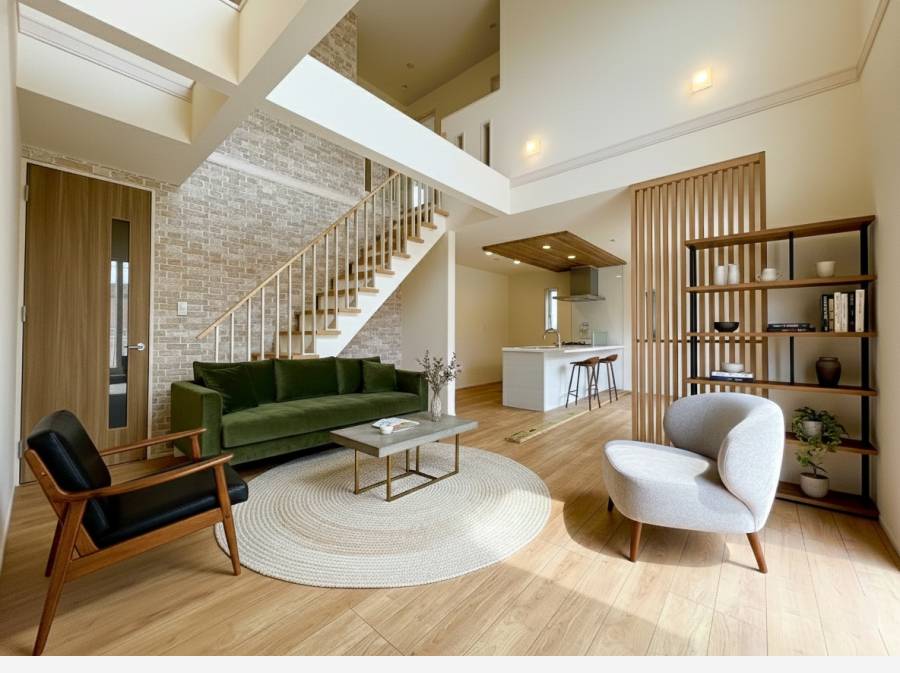 スケルトン階段と吹き抜けの開放感ある住宅※家具はCGになります