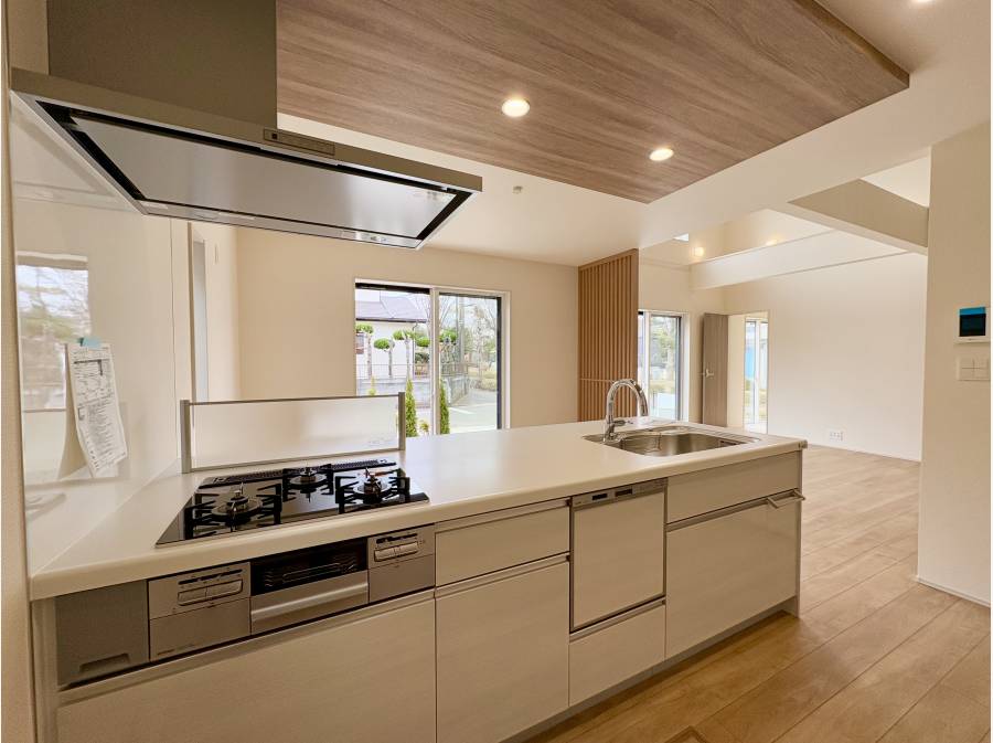20.0帖の広々LDKは、床暖房やリビング全体を見渡せる対面キッチンを採用し、吹き抜けが明るく開放的な空間を演出。