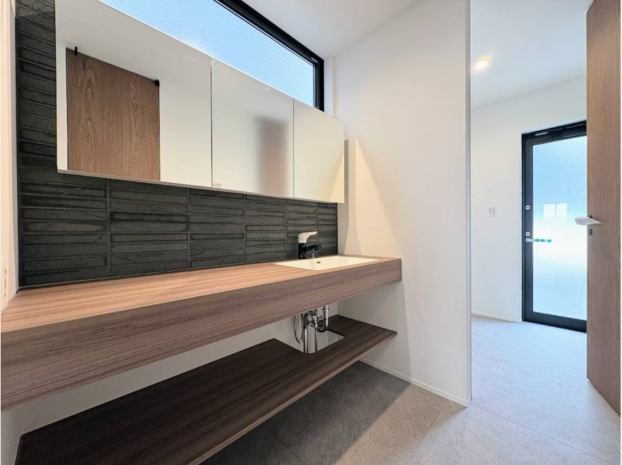 タイル張りの造作キッチンや、無駄を削ぎ落としたフラットな洗面スペースなど、随所に散りばめられた意匠が住まう人の個性を引き立てます。
