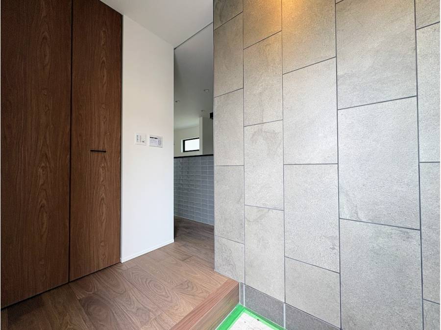 玄関に足を踏み入れると、重厚感のある石張りの壁が、シックで質のある日常を予感させてくれます。