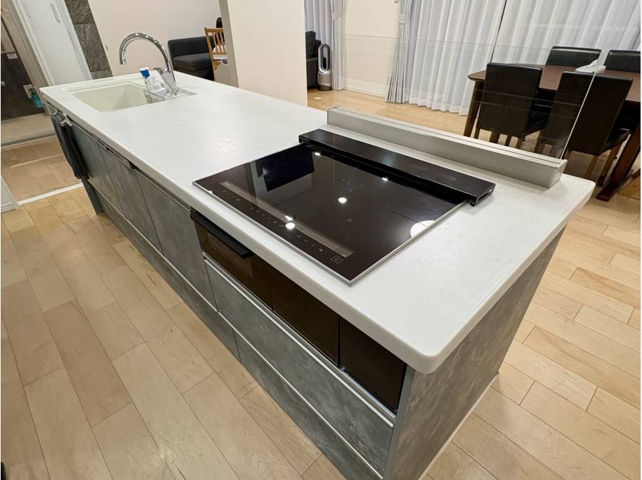 アイランドキッチンの背面には、回遊できるパントリーを備え、見た目と実用性の両立が図られています。