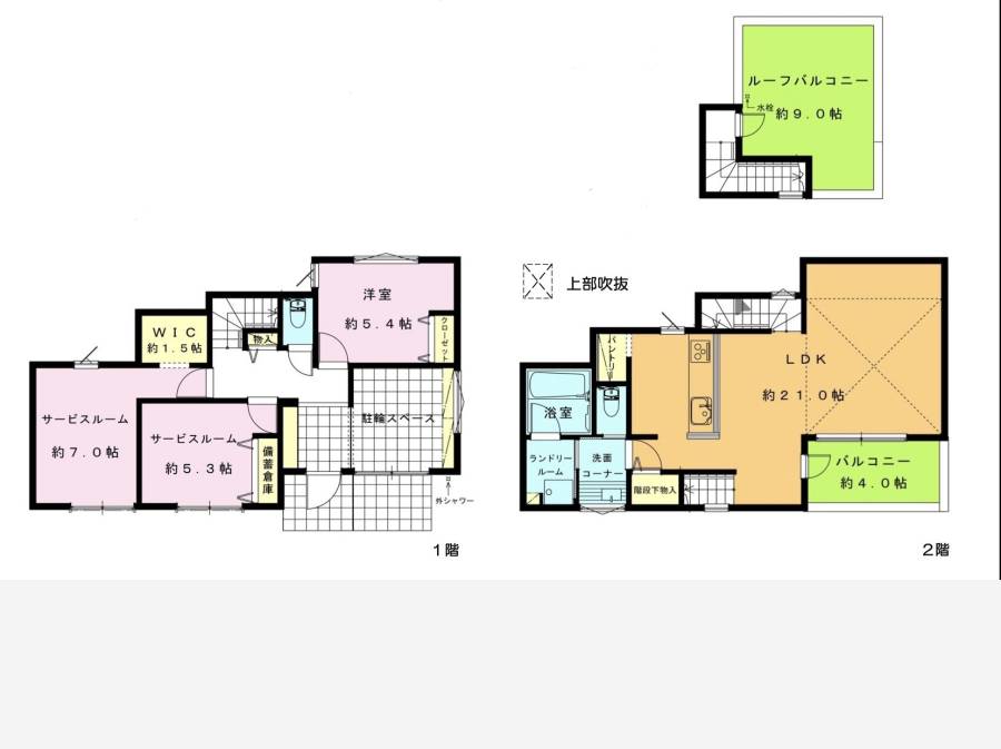 約21帖のLDKは吹抜けを採用し、光と開放感に満ちた設計。さらに約9帖のルーフバルコニーは、外からの視線を気にせずくつろげるプライベート空間として、セカンドリビングのようにお使いいただけます。