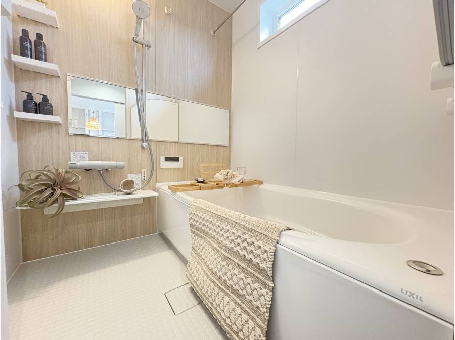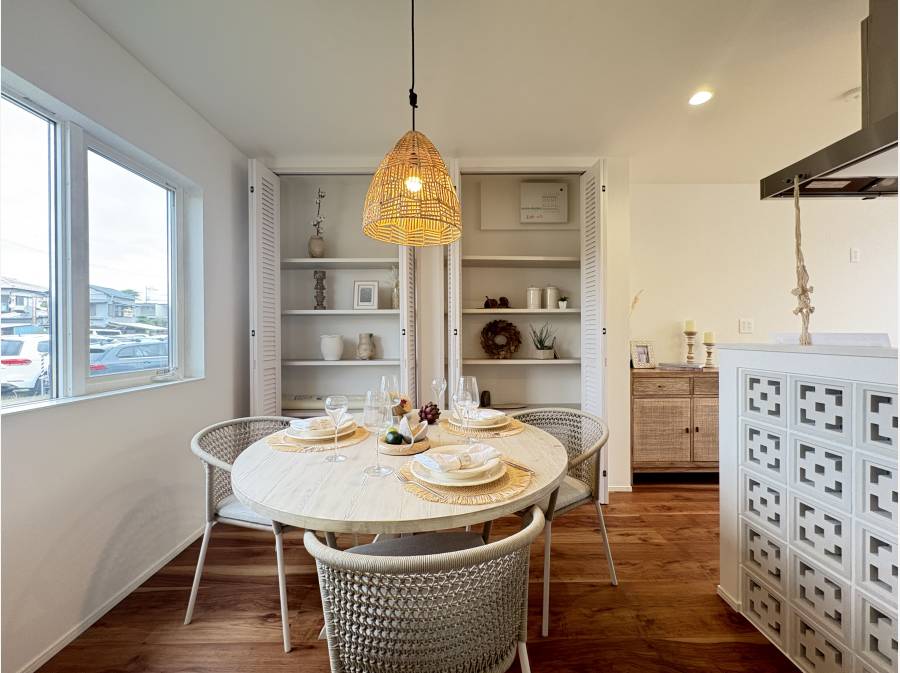 天井高は約3.2mの高天井を採用し、シーリングファンを標準装備。縦への広がりと明るい陽光が、伸びやかで心地よい住空間を演出します。キッチンは、家族との会話が弾むカウンターキッチンを採用。タッチレス水栓(浄水器付)や食器洗い乾燥機など、日々の家事をサポートする設備も充実しています。