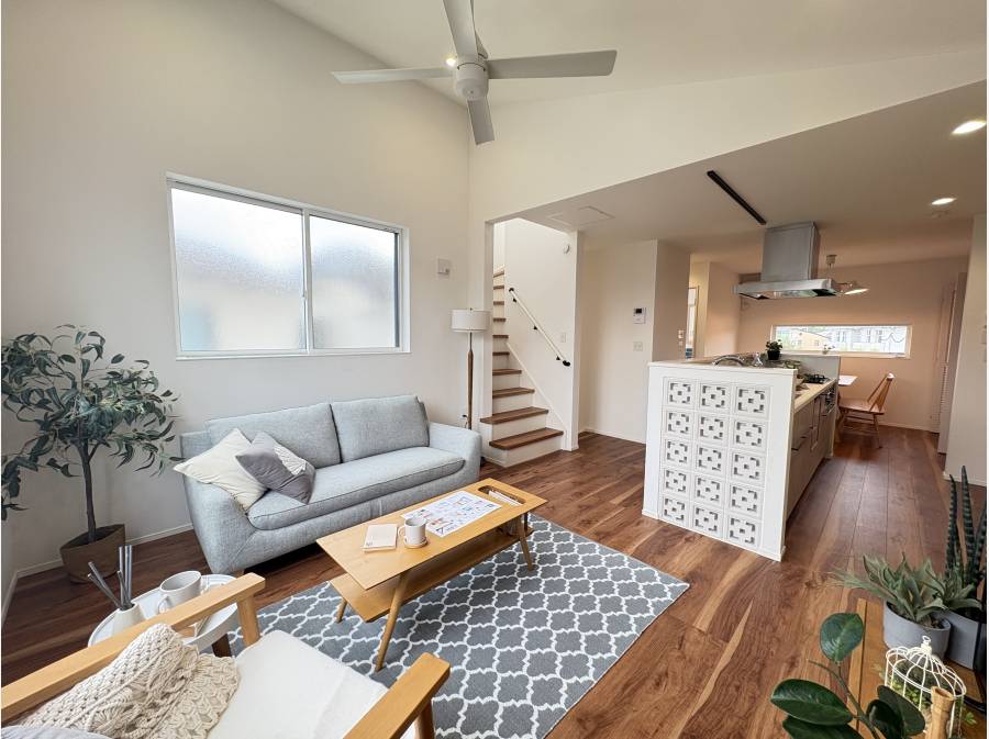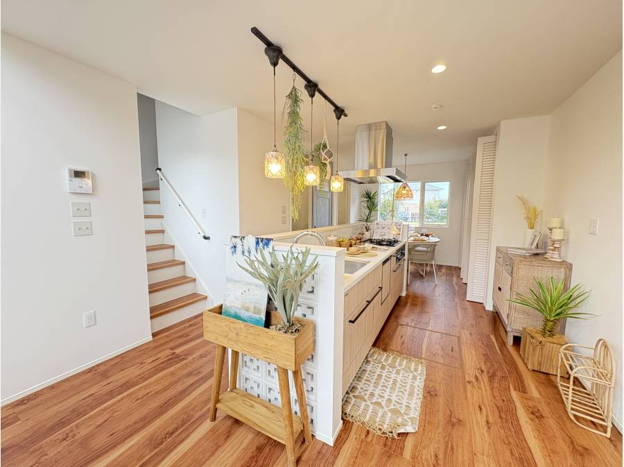 ■開放感のリビング。LDKはなんと約26.3帖の大空間を実現。天井高約2.8mの高天井に加え、シーリングファンや石張りのアクセントウォール(ストーンヴィラ仕様)が、リゾートホテルのような上質で静謐な空間を演出します。キッチンは開放的なアイランドキッチンを採用。回遊動線を取り入れ、家事効率にも配慮されています。