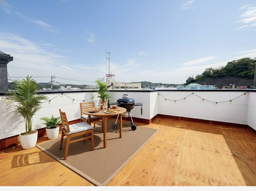 ■ 富士山・オーシャンビューの特等席。本物件のハイライトは、約20帖の広大なルーフバルコニー。 晴れた日には富士山と相模湾を一望できる、まさに特等席。スロップシンクやコンセントも完備しており、BBQやアウトドアリビングとして、湘南の風を感じながら非日常の時間を楽しめます。