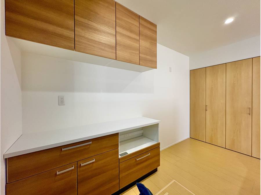 キッチンにはカップボードを設置、キッチンと同じ面材なので統一感のあるデザインに加え、スペースに合わせたサイズで空間を美しくみせます。