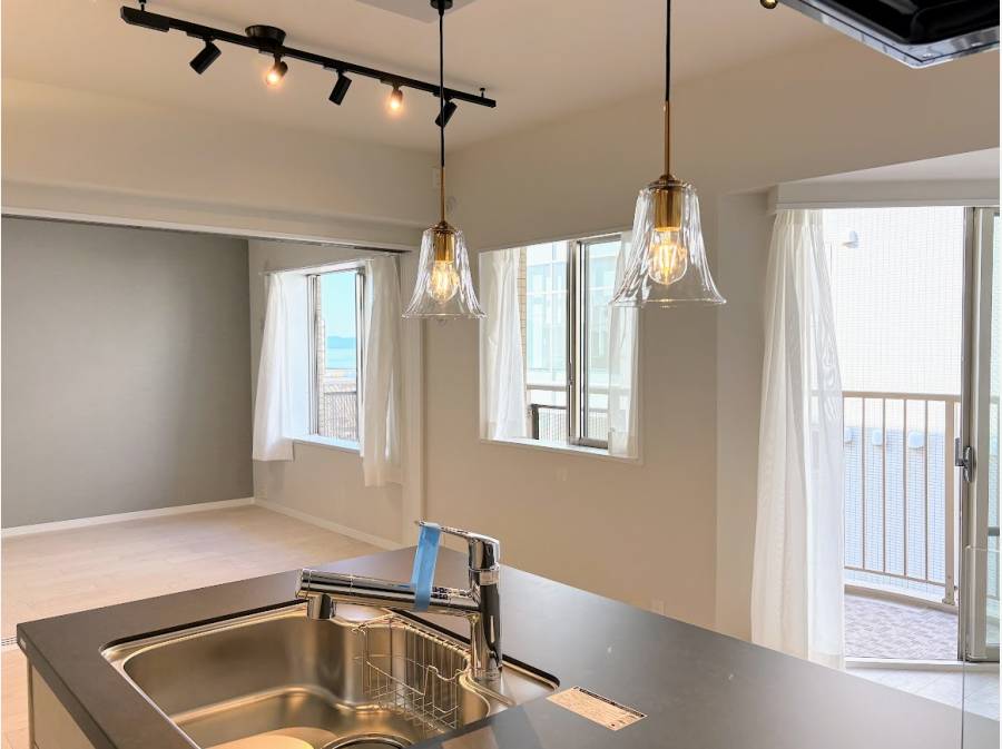 バルコニーからは開放感あふれる海のパノラマを、そしてリノベーションによって生まれ変わった室内は、細部までこだわり抜いたデザイン空間が広がります。特にキッチンは、家事をしながらふとした瞬間に海が目に留まる、洗練された設え。