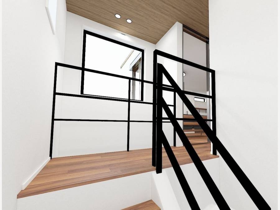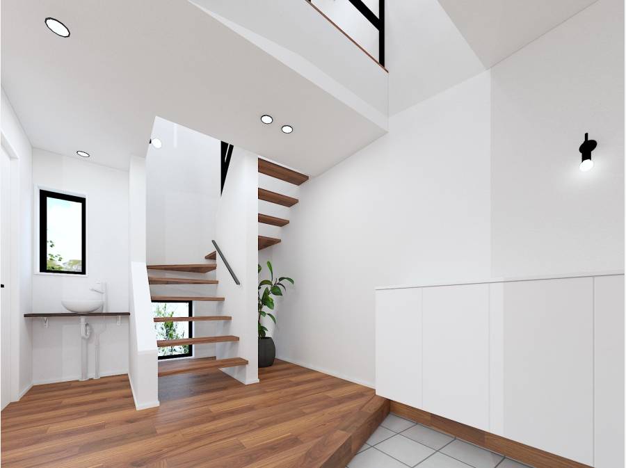 玄関の吹抜けやデザイン階段が開放感を演出し、パントリーや食洗機など、忙しい毎日を支える家事ラク設備も充実しています。
