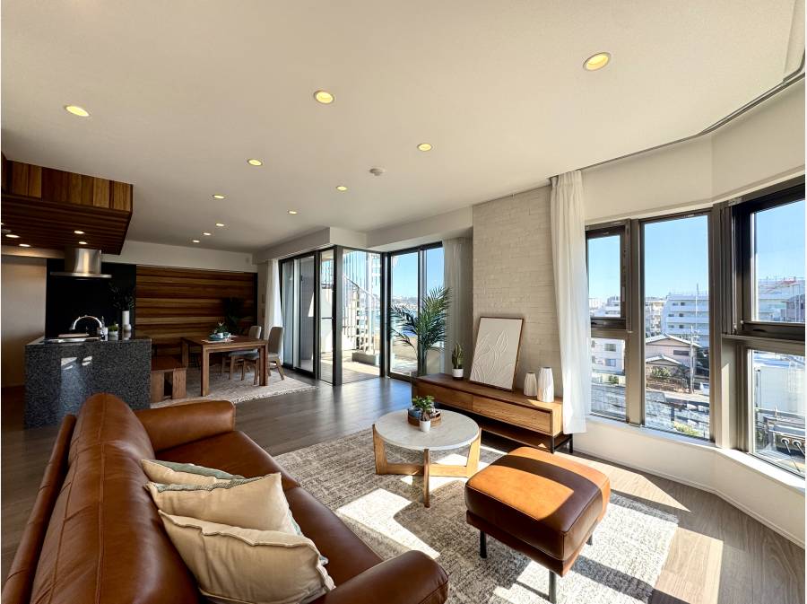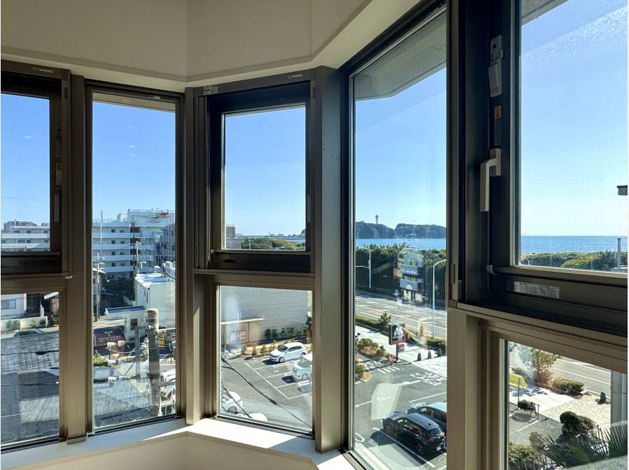 角部屋ならではの開放感のある窓の取り入れ方により室内から江ノ島と海