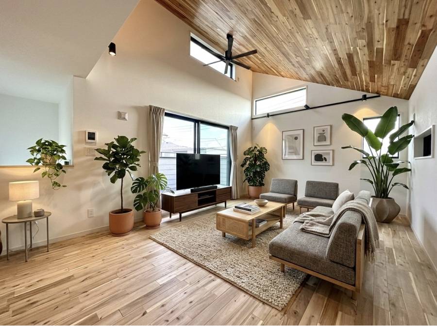 床面だけでなくリビングの天井にも施されており、天然木ならではの質感と温もりがを感じます。