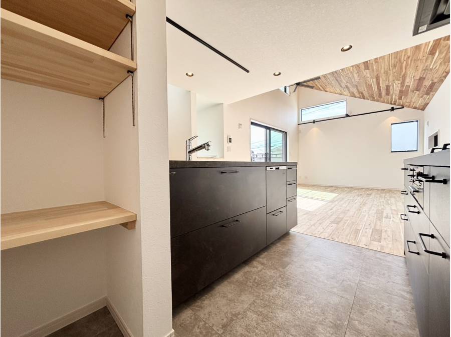勾配天井により実際の帖数以上の広がりを体感できます。グラフテクトのキッチンは作業スペースが広く、収納力も豊富で使い勝手良好。