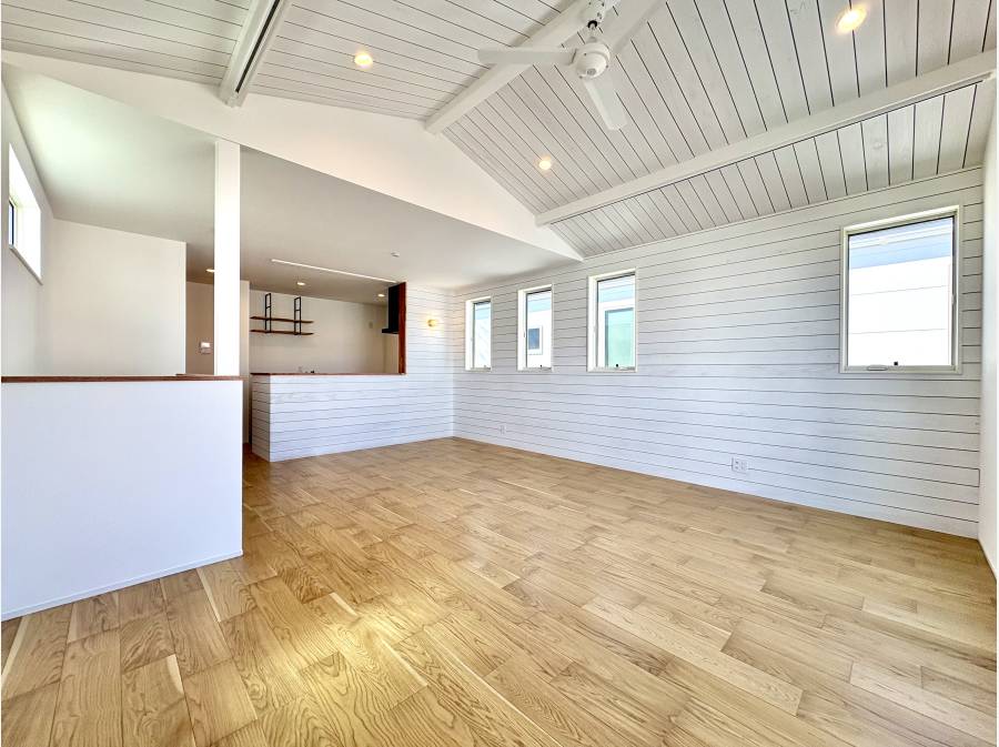 2階に配されたLDKは、上部に吹き抜けを設けることで、心地よい光と風を室内の隅々まで採り込みます。