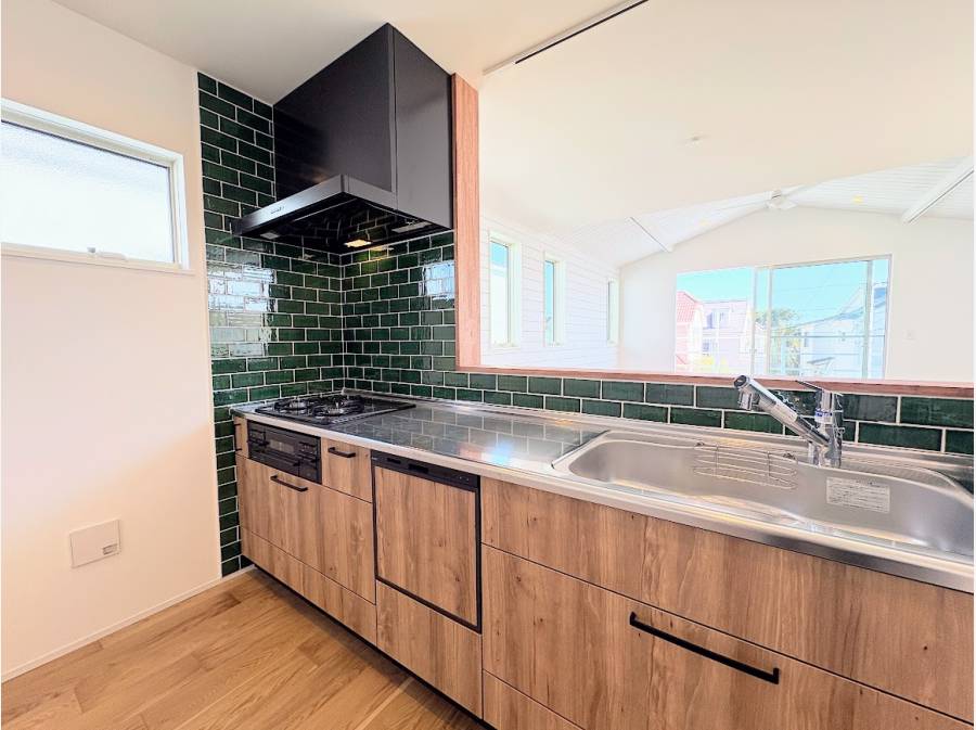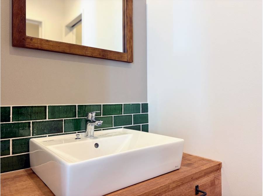 陽光が差し込む空間に、質感豊かなタイル張りのキッチンや、毎日の身支度が楽しくなる造作洗面台を設えました。