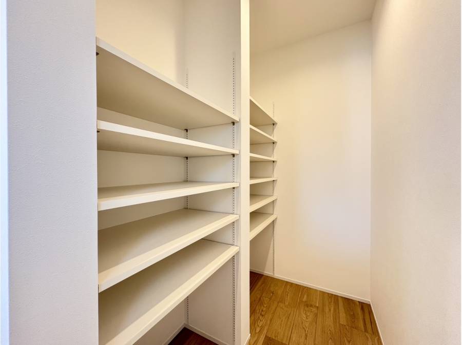 キッチンの裏には約1.5帖のパントリーを備えており、キッチン用品や食材のストックにも便利です♪