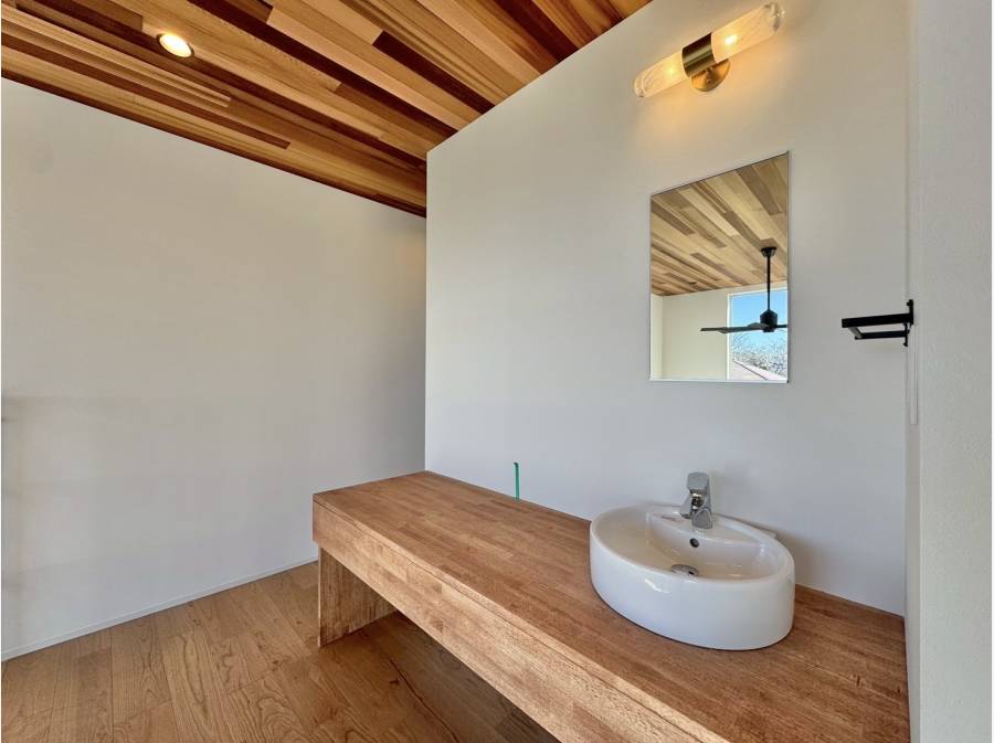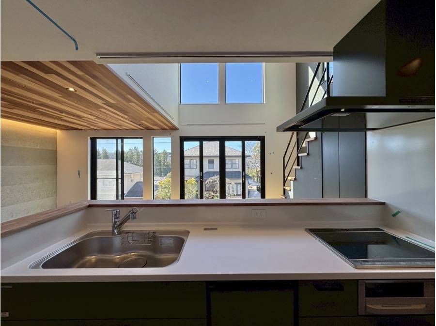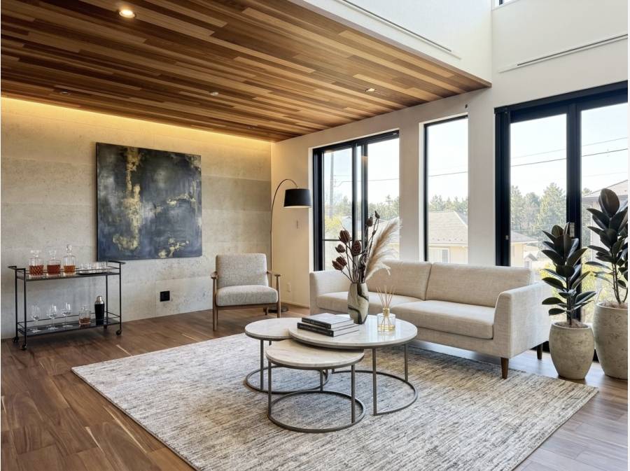 天井いっぱいに広がる木目の美しいアクセントと、吹抜けから差し込むやわらかな光。リビングに一歩足を踏み入れた瞬間、日常とは少し違う“上質な時間”が流れ始めます。大きな窓から取り込む自然光が空間全体を包み込み、朝は心地よく、夜は落ち着いたくつろぎの場へと表情を変えていきます。家族が自然と集まり、それぞれの時間を過ごしながらも同じ空気を共有できる設計。開放感とデザイン性を兼ね備えたこの住まいは、ただ住むだけではなく「暮らしを楽しむ」方におすすめです。